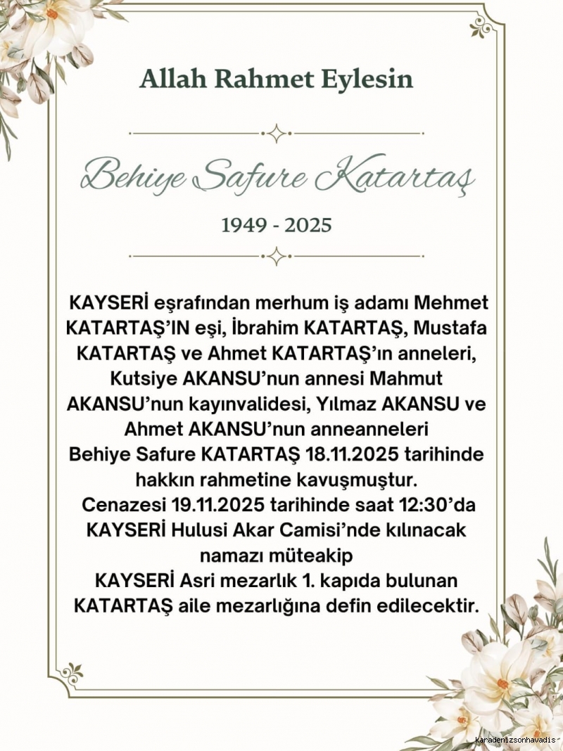 Kayseri eşrafından, merhum iş insanı Mehmet Katartaş'ın kıymetli eşi, değerli büyüklerimiz Mustafa Katartaş ve Ahmet Katartaş'ın anneleri, Yönetim Kurulu Başkanımız Yılmaz AKANSU ve Ahmet AKANSU'nun anneanneleri, BEHİYE SAFURE KATARTAŞ Hanımefendi'nin Hakk'ın rahmetine kavuştuğunu derin bir üzüntüyle öğrenmiş bulunmaktayız.