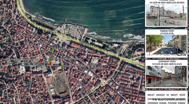 Toplu taşıma araçlarına yönelik yapılan düzenlemeler kapsamında; Postane yönüne hizmet veren 54, 54/B, 58, 58/A, 58/B, 62/A, 68 ve 68/A numaralı hatların Orta Camii önündeki durağı, Doğakent yönüne hizmet veren 54, 54/B, 58, 58/A, 58/B, 61 ve 61/A numaralı hatların Kalafatlar karşısındaki durağı, Taşbaşı yönüne giden 67, 67/A ve 67/B numaralı hatların ise Vakıfbank karşısındaki durağı kullanacağı bildirildi.