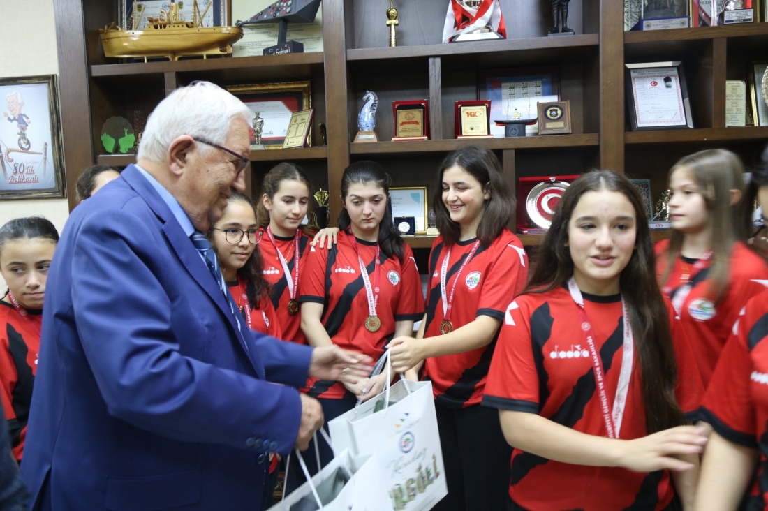U14 Bolu Basketbol Ligi’ne katılarak şampiyon olan kız basketbol takımı, Başkan Posbıyık’ı ziyaretinde büyük sevinç yaşadı. Başkan Posbıyık sporcuları, teknik heyeti ve ailelerini kapıda karşılayarak tek tek tebrik etti.