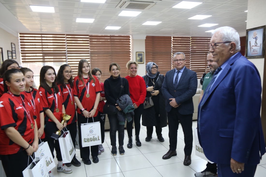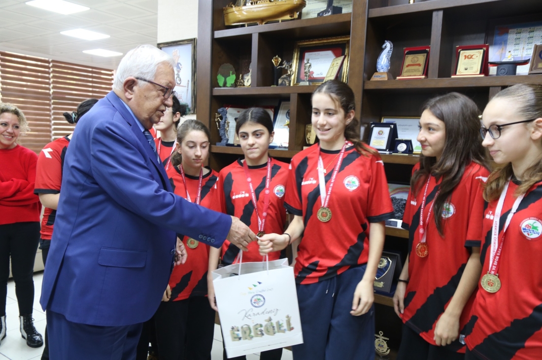Bölgemizi temsil eden tek basketbol takımı olan ve Zonguldak'ta lig olmadığı için U14 Bolu Basketbol Ligi'ne katılan Kdz. Ereğli Belediyespor Kız Basketbol Takımı, Bolu'da kazandıkları şampiyonluk kupasıyla birlikte Kdz. Ereğli Belediye Başkanı Halil Posbıyık'ı makamında ziyaret etti.