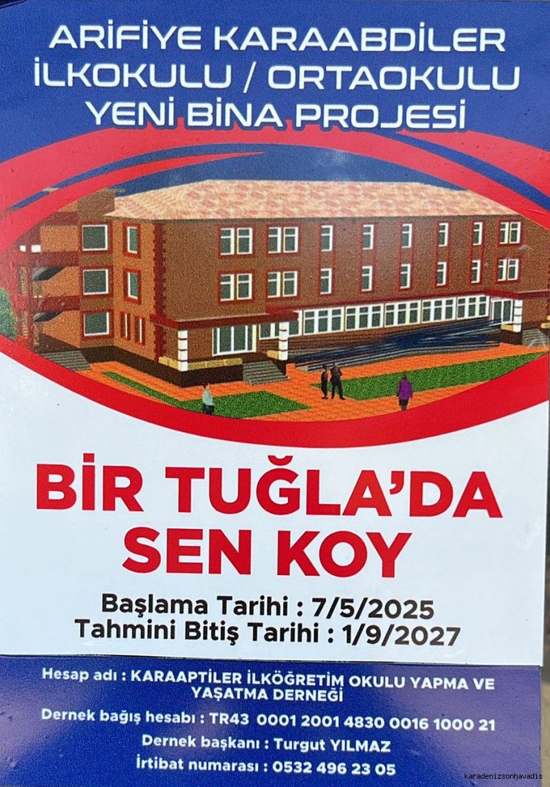 5620 m² alan üzerinde yapımına 7 Mayıs 2025 tarihinde başlanan Sekiz Derslikli ve iki katlı ilköğretim okulunda, kaba inşaat bitmek üzere. 60 Milyon Türk lirasına mal olması beklenen okulun inşaatına Dernek ve Arifiye Belediyesi tarafından bu güne kadar On yedi milyon Türk Lirası civarında harcama yapıldı. Okul inşaatına kaynak oluşturmak amacıyla, mahalle sakinlerinin talebi üzerine Nehirkent Belediyesi tüzel kişiliğine ait iken, 2009 yılında Arifiye Belediyesine devredilen Karaabdiler Mahallesi 1603 Ada üzerinde bulunan 17 No’lu Parsel, 11.02.2026 tarihinde 2886 Sayılı Devlet İhale Kanunu’nun 45’nci maddesine göre Açık Teklif Usulü ile yapılacak ihalede satılacak. Satıştan elde edilecek gelir, Arifiye Belediyesi tarafından okul inşaatında kullanılacak. İhale ile bilgilere; https://www.arifiye.bel.tr/guncel/ihale-ilanlari/devam-edenler/gayri-menkul-satis-i-halesi linki üzerinden ulaşılabilir.