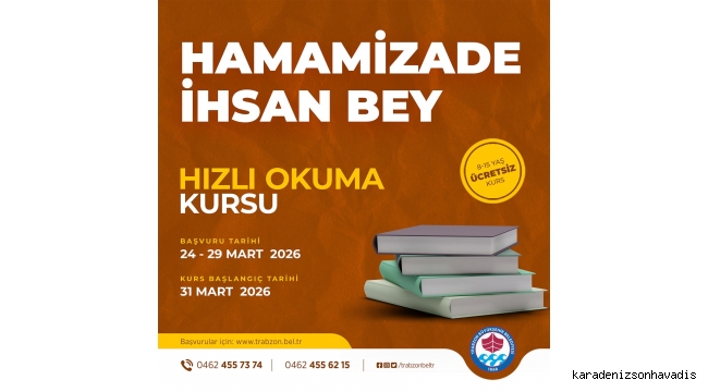 Trabzon Büyükşehir Belediyesi, çocukların eğitim hayatına katkı sunmaya yönelik çalışmalarını sürdürüyor. Bu kapsamda, Kültür, Sanat ve Sosyal İşler Dairesi Başkanlığı Mesleki Eğitim Şube Müdürlüğü tarafından 8-15 yaş aralığındaki öğrencilere yönelik ‘Hızlı Okuma Etkinliği’ düzenlenecek. Hamamizade İhsan Bey Kültür ve Sanat Merkezi’nde gerçekleştirilecek etkinlik için başvurular devam ediyor. Programa katılmak isteyen öğrenciler, 29 Mart 2026 tarihine kadar Trabzon Büyükşehir Belediyesi’nin resmi internet sitesi olan www.trabzon.bel.tr adresi üzerinden başvurularını yapabilecek. Eğitimler ise 31 Mart 2026 tarihinde başlayacak. Trabzon Büyükşehir Belediyesi’nden yapılan açıklamada, “Çocuklarımızın eğitimine katkı sunmayı öncelikli görevlerimiz arasında görüyoruz. Gerçekleştireceğimiz program ile çocuklarımızın okuma hızlarını artırmayı, okuduğunu anlama becerilerini geliştirmeyi ve akademik başarılarına katkı sağlamayı hedefliyoruz” denildi.