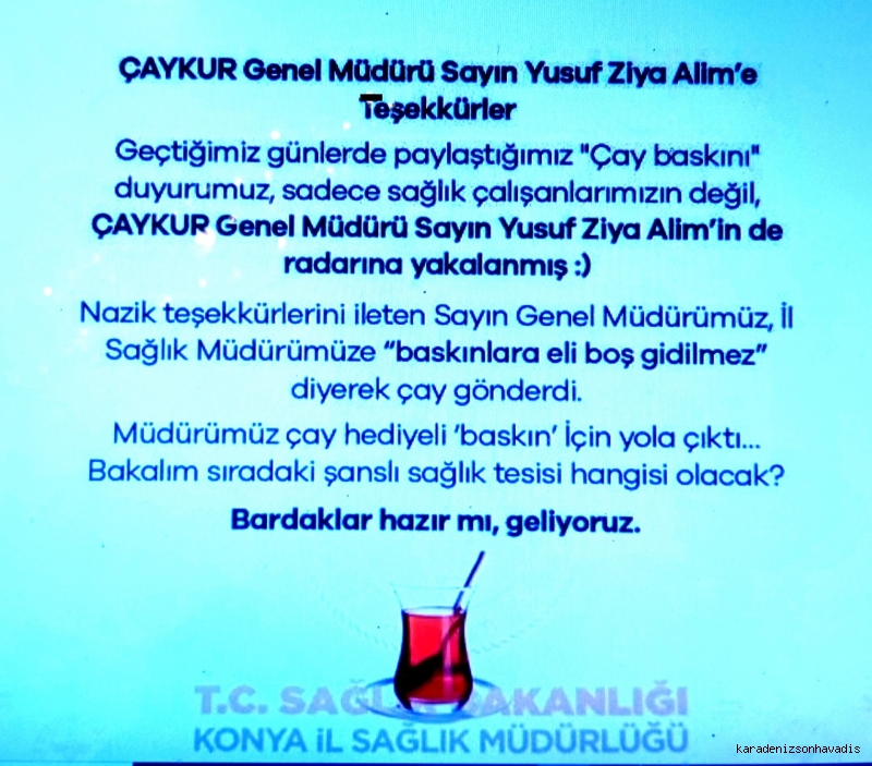 Sağlık çalışanlarına moral vermek amacıyla zaman zaman gece saatlerinde sağlık tesislerine sürpriz ziyaretlerde bulunan, Konya Sağlık İl Müdürü Doç. Dr. Yusuf Yavuz’un sosyal medyadaki bu mesajını gören ÇAYKUR Genel Müdürü Yusuf Ziya Alim’in dikkatini çekti. ÇAYKUR'un Konya Sağlık İl Müdürlüğü, Rize ÇAYKUR’dan gelen çeşitli çay hediyesinin adreslerine ulaşmasının hemen ardından, Konya İl Sağlık Müdürlüğü'nden yapılan yeni paylaşımda şu ifadelere yer verildi: "ÇAYKUR Genel Müdürü Sayın Yusuf Ziya Alim'e teşekkürler. Geçtiğimiz günlerde yaptığımız ‘çay baskını' çağrımız, Sayın Genel Müdürümüzün de radarına yakalanmış. Çay hediyesi ulaştı. Müdürümüz çaylı yeni bir baskın için yola çıktı. Bardaklar hazır mı? Geliyoruz…” paylaşımı yapıldı.