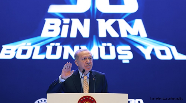 Eğitimden sağlığa, teknolojiden savunma sanayine her alanda başarıdan başarıya koştuklarını, başkalarıyla değil, her zaman kendileriyle yarıştıklarını aktaran Cumhurbaşkanı Erdoğan, şöyle devam etti: "Hep daha iyisini, daha güzelini, ilerisini hedefledik. Eski Türkiye'yi bilen herkes bugün şu gerçeği kabul ediyor: İktidarlarımızın başarı hikâyesi yazdığı, Türkiye'ye çağ atlattığı, Türkiye'nin makûs talihini değiştirdiği alanların en başında ulaştırma vardır. Kara, hava, deniz yolları ulaşımında bir yandan proje ve yatırımlarımızla altyapıyı güçlendirirken diğer yandan yolcu sayısını en yüksek seviyelere getirdik. Biliyorsunuz 10 gün önce Ankara'da Esenboğa Havalimanı'mızın üçüncü pistiyle yeni kule ve tamamlayıcı tesislerin açılışını gerçekleştirdik. İstanbul Havalimanı'mız, dünyanın en gözde havalimanlarından biri olarak kendi alanında küresel bir markaya dönüştü. Deniz ulaşımında daha önce hayal dahi edilemeyen projeleri hayata geçirdik. Kara yolu ulaşımında ise adeta destan yazdık. Bakın şuraya özellikle dikkatinizi çekmek istiyorum. Göreve geldiğimizde bölünmüş yol uzunluğumuz ne kadardı? Sadece 6 bin 101 kilometreydi. Yalnızca altı vilayetimiz bölünmüş yollarla birbirine bağlıydı. Tek gidişli gelişli yollarda milletimizin ömründen ömür gidiyordu. Türkiye'ye yakışmayan, milletimize yakışmayan bu tabloyu değiştirdik. Hiç vakit kaybetmeden çalışmaları başlattık ve 23 yılda bölünmüş yollarla birbirine bağlanan il sayımızı 77'ye, bölünmüş yol uzunluğumuzu ise tam 30 bin 49 kilometreye çıkardık. İşte bugün de bölünmüş yollarımızın 30 bininci kilometresinin kurdelesini sizlerle birlikte kesmenin heyecanı içindeyiz."