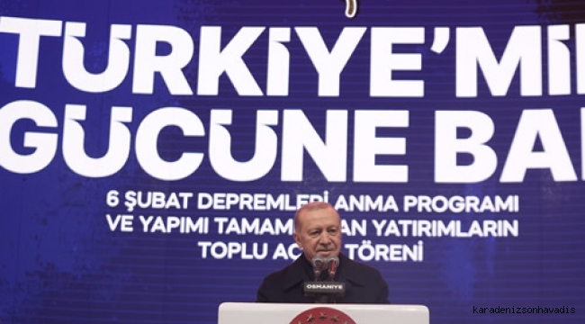 Depremden sonra Osmaniye'de pek çok faaliyet yürüttüklerini kaydeden Cumhurbaşkanı Erdoğan, "Depremde zarar gören okullarımızın imarından, Korkut Ata Üniversitemizin bakım ve onarım çalışmalarına, sağlıktan ulaştırma ve tarım alanındaki ihtiyaçların giderilmesine kadar her sıkıntısında şehrimizin yanında olduk" ifadelerini kullandı.