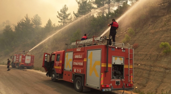 Kdz. Ereğli Belediyesi İtfaiye Müdürlüğü’ne bağlı 2 araç ve 8 personelden oluşan yardım ekibi, Antalya Manavgat’ta devam eden orman yangınını kontrol altına almak için mücadelesini sürdürüyor.