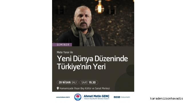Trabzon Büyükşehir Belediyesi'nin Nisan ayı kültür sanat etkinlikleri kapsamında yarın, emekli asker ve güvenlik politikaları uzmanı Mete Yarar, "Yeni Dünya Düzeninde Türkiye'nin Yeri” konulu seminer gerçekleştirecek.