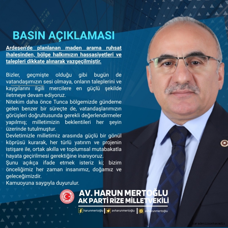 "Ardeşen’de planlanan maden arama ruhsat ihalesinden bölge halkımızın hassasiyetleri ve talepleri dikkate alınarak vazgeçilmiştir. Bizler, geçmişte olduğu gibi bugün de vatandaşımızın sesi olmaya, onların taleplerini ve kaygılarını ilgili mercilere iletmeye devam ediyoruz."