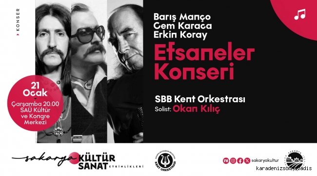 Sakarya Büyükşehir Belediyesi, Ocak kültür sanat etkinlikleri kapsamında 21 Ocak Çarşamba günü saat 20.00’de SAÜ Kültür ve Kongre Merkezi’nde Türk rock müziğine damga vuran Barış Manço, Cem Karaca ve Erkin Koray’ı, unutulmaz şarkılarıyla anacağı özel bir konser düzenliyor.