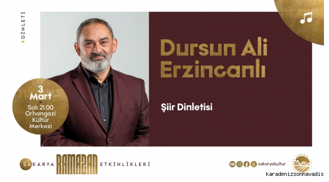 Büyükşehir Ramazan Kültür Sanat Etkinlikleri, Dursun Ali Erzincanlı’nın konuk olacağı şiir dinletisiyle devam edecek. 3 Mart Salı günü Orhangazi Kültür Merkezi’nde düzenlenecek program saat 21.00’da başlayacak.