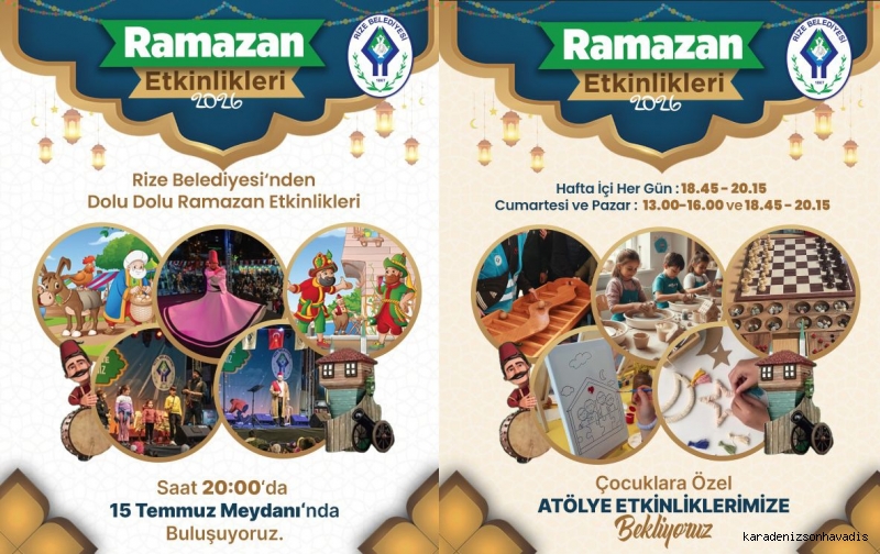 Rize Belediyesi, Ramazan Ayının ilk 20 günü boyunca 80 sahne gösterisiyle ve bir çok atölye etkinlikleriyle birlik, beraberlik ve paylaşma ayı olan Ramazan'ın coşkusunu hep birlikte yaşamak üzere tüm vatandaşları 15 Temmuz Demokrasi ve Cumhuriyet Meydanı'nda kurulan dev çadıra davet ediyor.