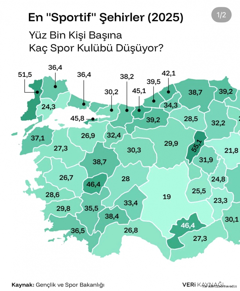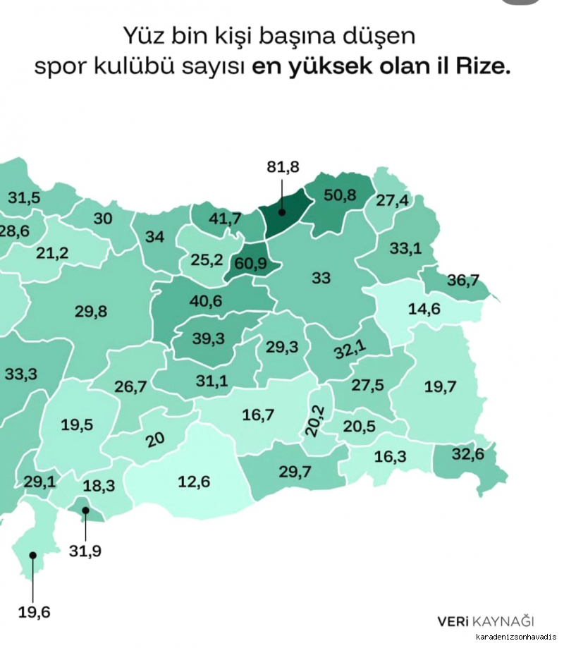 Gençlik ve Spor Bakanlığı verilerine göre yüz bin kişi başına düşen spor kulübü sayısında Rize, 81,8 oranıyla Türkiye’de ilk sıraya yerleşti. Türkiye ortalamasının 29,9 olduğu tabloda Rize’nin ulaştığı bu oran, kentin spor alanındaki yükselişini gözler önüne serdi.