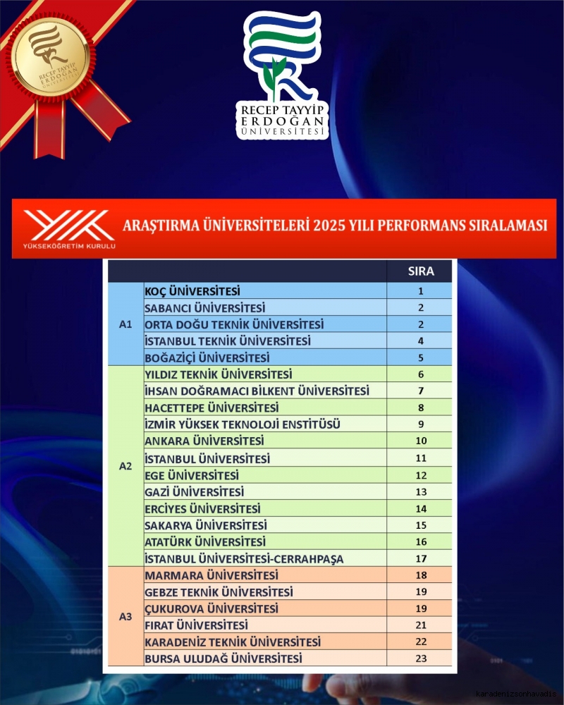 Yükseköğretim Kurulu tarafından açıklanan 2025 Yılı Araştırma Üniversiteleri Performans Sıralaması sonuçlarına göre RTEÜ, “Araştırma Üniversitesi Adayı” olarak izlemeye alınan üniversiteler listesine girdi.