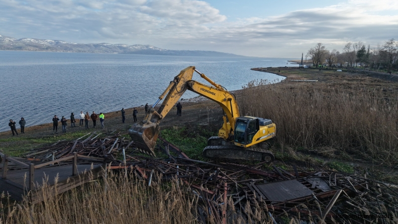Sapanca Gölü çevresinde kamuya ait alanları işgal eden kaçak iskelelerin kaldırılması için iş makinaları çalıştı, 89 kaçak iskelenin temizlenmesi için çalışmaları resmen başladı.