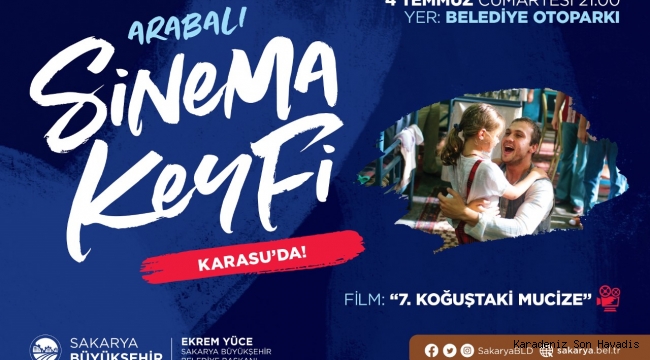 Büyükşehir Belediyesi tarafından düzenlenen ve vatandaşların yoğun ilgi gösterdiği arabalı sinema gösterimi 4 Temmuz Cumartesi günü Karasu’da devam edecek. Saat 21.00’de başlayacak olan ‘7. Koğuştaki Mucize’ filmi Karasu Belediye Otoparkında sinemaseverler ile buluşacak.