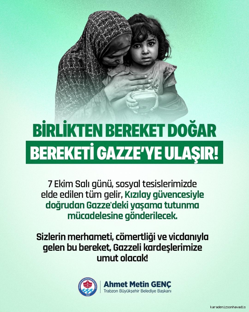 Trabzon Büyükşehir Belediyesi, işgalci İsrail'in soykırım uyguladığı Gazze halkına yönelik yardım seferberliğini sürdürüyor. Büyükşehir Belediye Başkanı Ahmet Metin Genç’in büyük hassasiyet gösterdiği bu insanlık dramında, yaşama hakkı ellerinden alınan Gazze halkı için yeni bir destek kampanyası hayata geçiriliyor. “Birlikten bereket doğar, bereket Gazze’ye ulaşır” sloganıyla başlatılan kampanya kapsamında, yarın (7 Ekim Salı) Büyükşehir Belediyesi’ne bağlı tüm sosyal tesislerde elde edilecek gelir, Kızılay güvencesiyle doğrudan Gazze’ye ulaştırılacak. Trabzon halkının desteğiyle toplanan her kuruş, Gazze’de hayatta kalma mücadelesi veren mazlumlara umut olacak.