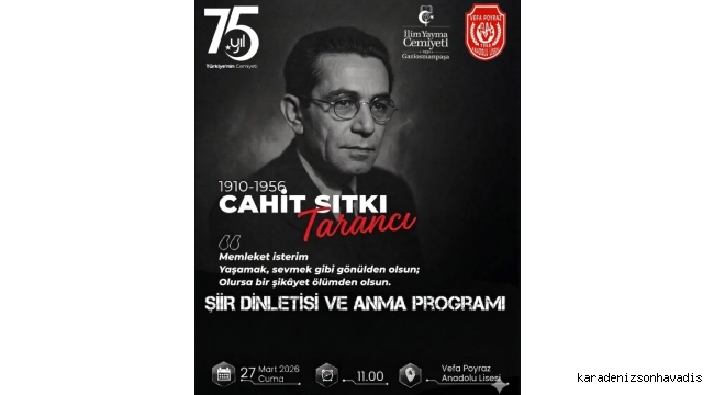 Türk edebiyatının unutulmaz isimlerinden, "Memleket İsterim" ve "Otuz Beş Yaş" şiirlerinin ölümsüz şairi Cahit Sıtkı Tarancı, vefatının yıl dönümü yaklaşırken özel bir programla anılıyor. İlim Yayma Cemiyeti Gaziosmanpaşa Şubesi ve Vefa Poyraz Anadolu Lisesi iş birliğiyle düzenlenen "Şiir Dinletisi ve Anma Programı", edebiyatseverleri ve gençleri bir araya getirecek. Cemiyetin 75. yıl etkinlikleri kapsamında gerçekleştirilecek olan bu buluşma, Tarancı'nın derinlikli dünyasını ve memleket sevdasını yeniden hatırlatmayı hedefliyor. Etkinlik Detayları Programda şairin en sevilen şiirleri seslendirilecek ve edebi kişiliği üzerine paylaşımlar yapılacak. Katılmak isteyenler için program bilgileri şu şekildedir: Tarih: 27 Mart 2026, Cuma Saat: 11.00 Yer: Vefa Poyraz Anadolu Lisesi "Memleket isterim / Yaşamak, sevmek gibi gönülden olsun; / Olursa bir şikâyet ölümden olsun." Cahit Sıtkı Tarancı’nın bu zamansız dizelerinde hayat bulan memleket özlemi ve yaşam sevincini yerinde hissetmek isteyen tüm edebiyat dostları davetlidir.
