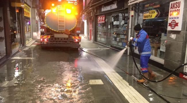 Trabzon Büyükşehir Belediyesi, koronavirüs tedbirleri kapsamında çevre temizliği çalışmalarına gece gündüz demeden devam ediyor. Büyükşehir ekipleri, halkın yoğun olduğu Meydan bölgesindeki cadde ve sokaklarda deterjanlı su ile yıkama ve temizleme çalışması gerçekleştiriyor.